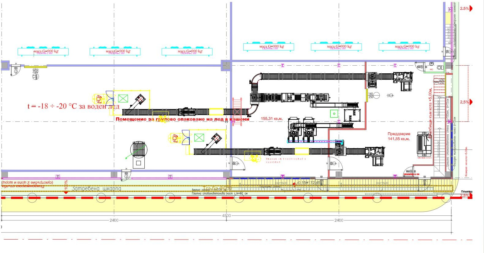 本工廠規劃專為歐洲客戶設計,包含2套10噸製冰機、1套自動冰杯灌裝封口機、2套冰袋包裝機,以及配備機器人堆垛機的自動紙箱包裝線,提供完整的交鑰匙工程解決方案。